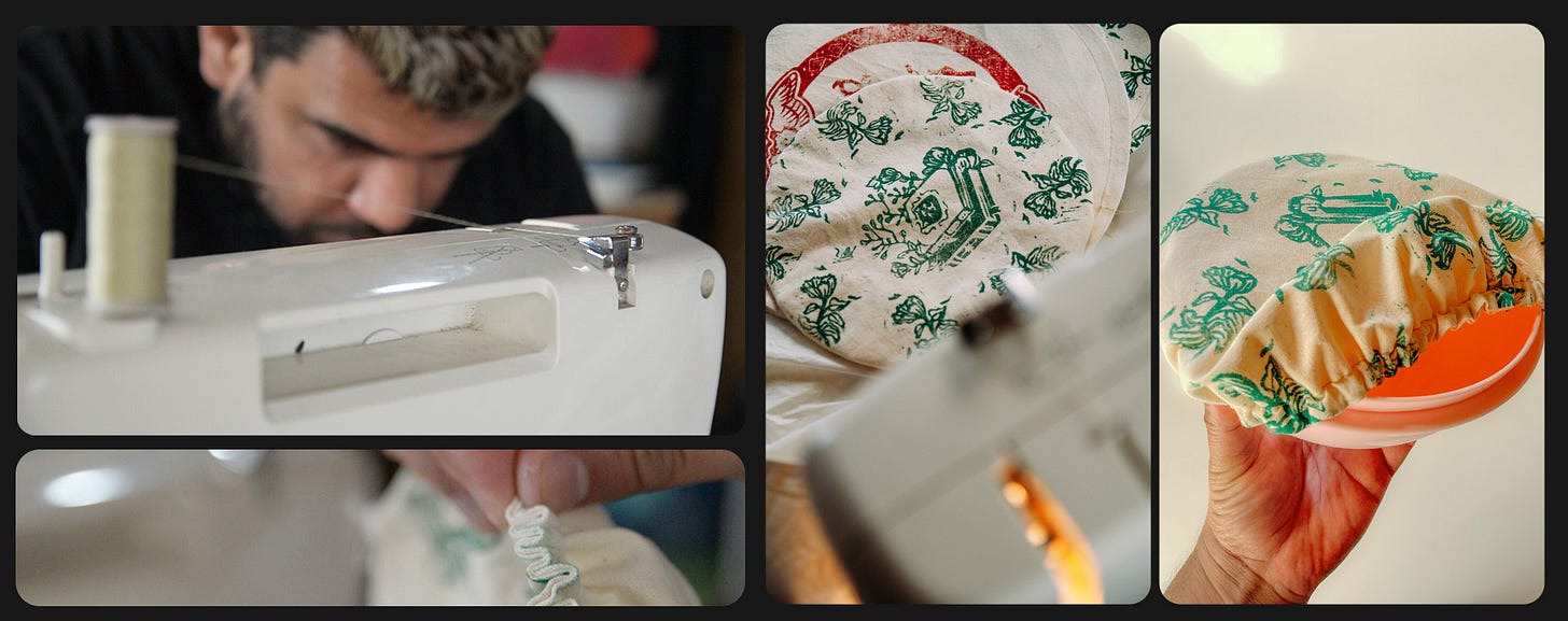 Los cubre bowls, por ejemplo—perfectos para quienes siempre pierden las tapaderas de sus recipientes—, también tuvieron su propia curva de aprendizaje. Usé una máquina de coser por primera vez e incluso intentamos enviar uno a Ohio… aunque no salió como esperábamos.