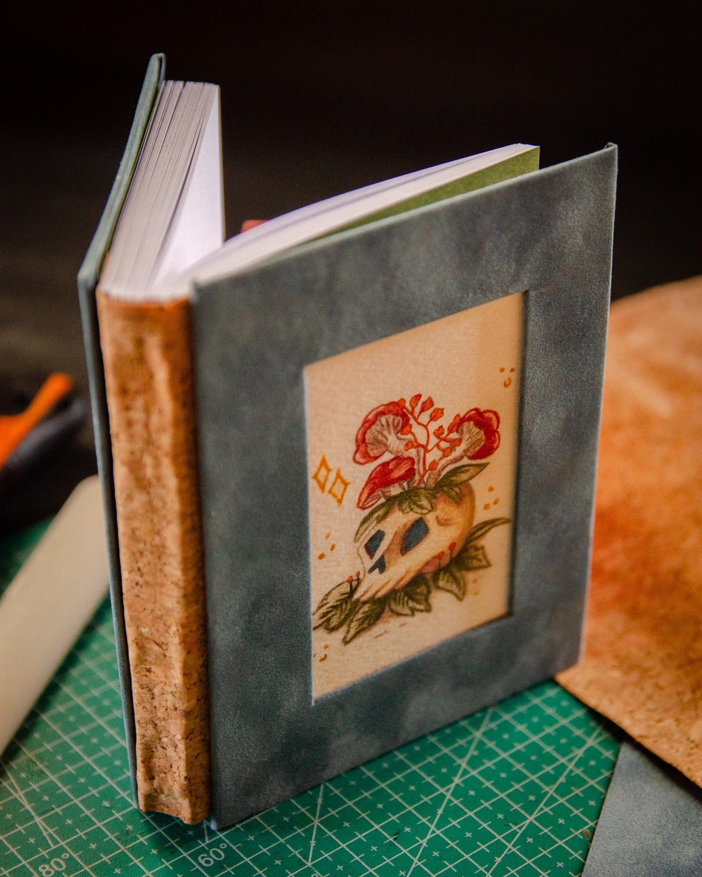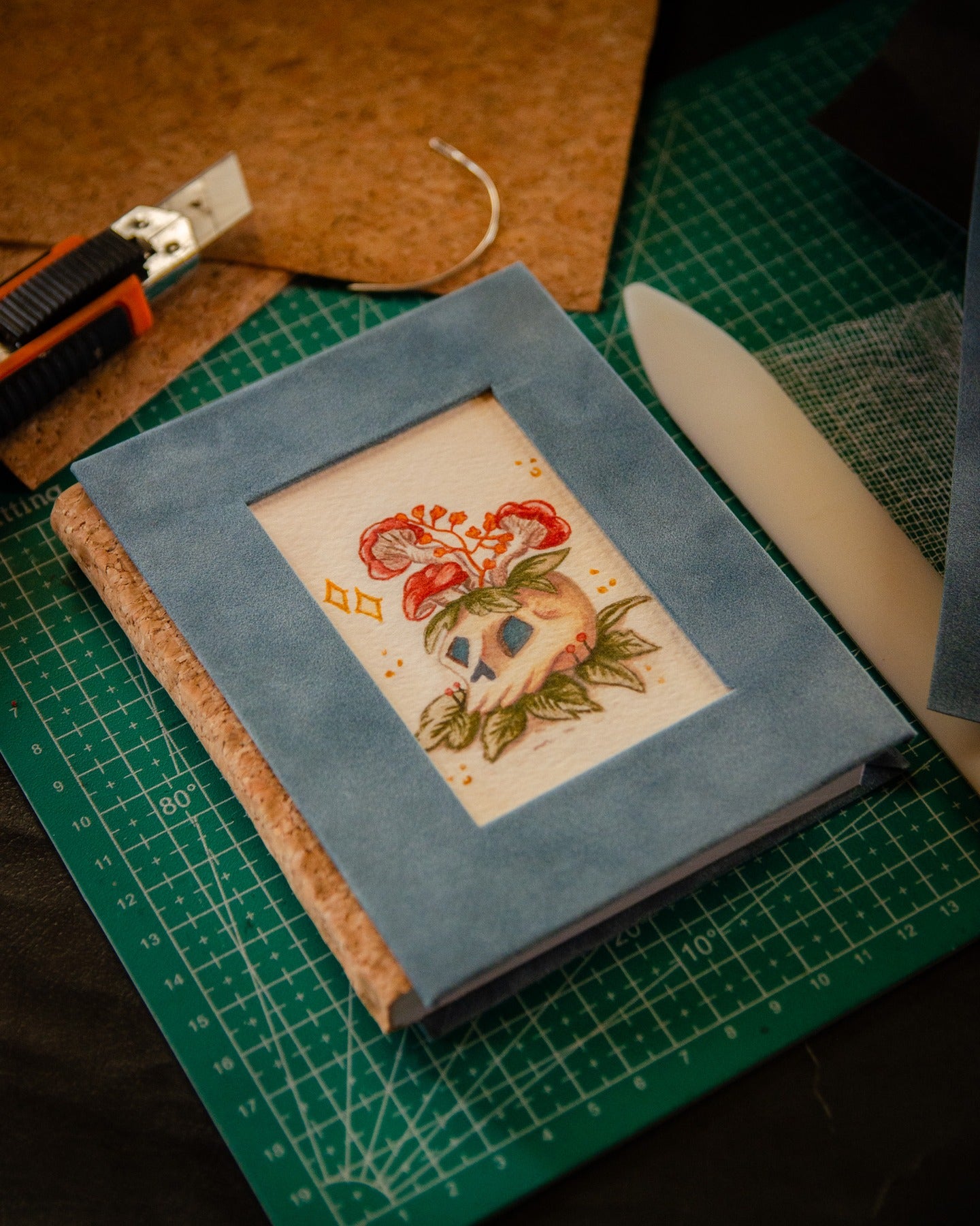 Este cuaderno hecho a mano es una pieza única para amantes del arte, la escritura y la papelería especial. Su portada combina materiales cuidadosamente seleccionados: un marco en textura gamuza azul, lomo en corcho natural y una ilustración central impresa en papel artístico con acabado acuarela. Cada elemento se ensambla a mano, creando un objeto duradero, estético y completamente original.